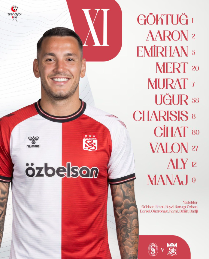 Göktuğ (1), Aaron (2), Emirhan (5), Mert (20), Murat (7), Uğur (58), Charisis (8), Cihat (80), Valon (27), Aly (12), Manaj (9)