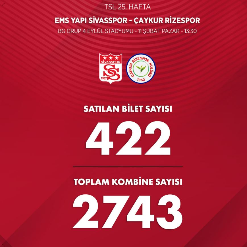 Yapılan açıklamada: " EMS Yapı Sivasspor'umuz ile Çaykur Rizespor arasında oynanacak mücadele öncesi satılan bilet ve kombinelerin güncel rakamları şu şekilde." ifadelerine yer verilirken,