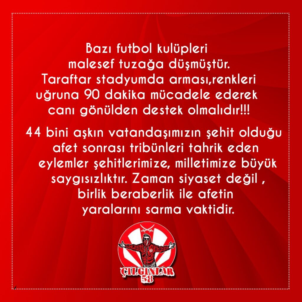 Sivasspor Taraftar Grubu Çılgınlar 58 sosyal medya hesabından açıklama yaptı.