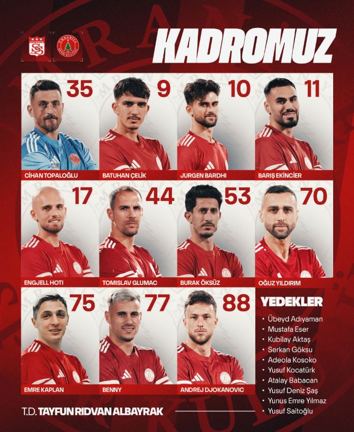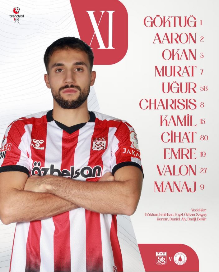 Sivasspor mücadeleye; Göktuğ, Aaron, Okan, Murat, Uğur, Charisis, Kamil, Cihat, Emre, Valon ve Manaj ilk 11’i ile başlayacak.
