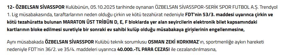 Karara göre, Özbelsan Sivasspor taraftarlarının müsabakada neden olduğu çirkin ve kötü tezahüratlar nedeniyle, Futbol Disiplin Talimatı’nın 53/3. maddesi uyarınca ceza verildi.