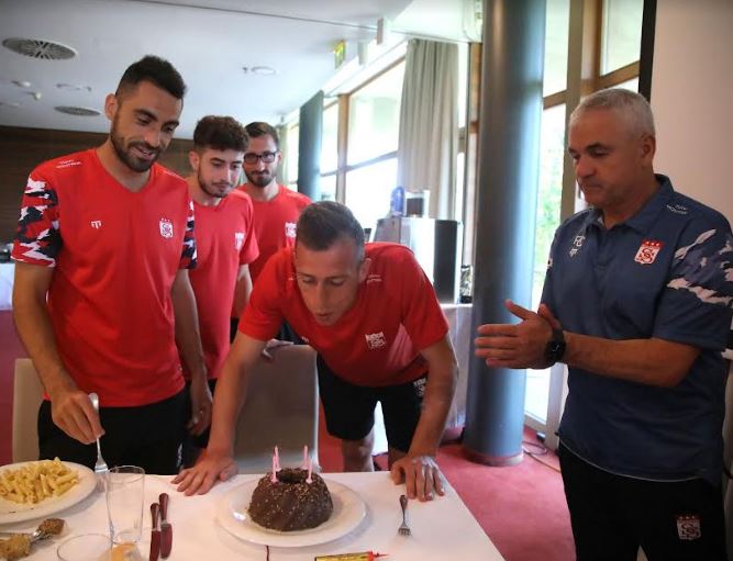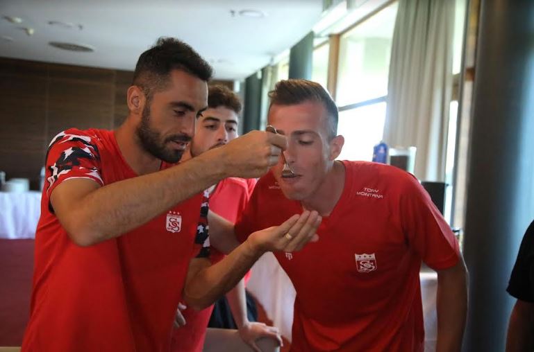 Avusturya'da kampta bulunan Demir Grup Sivasspor'umuzda takım kaptanlarımızdan Hakan Arslan için öğlen yemeğinin ardından sürpriz bir organizasyon düzenlendi.