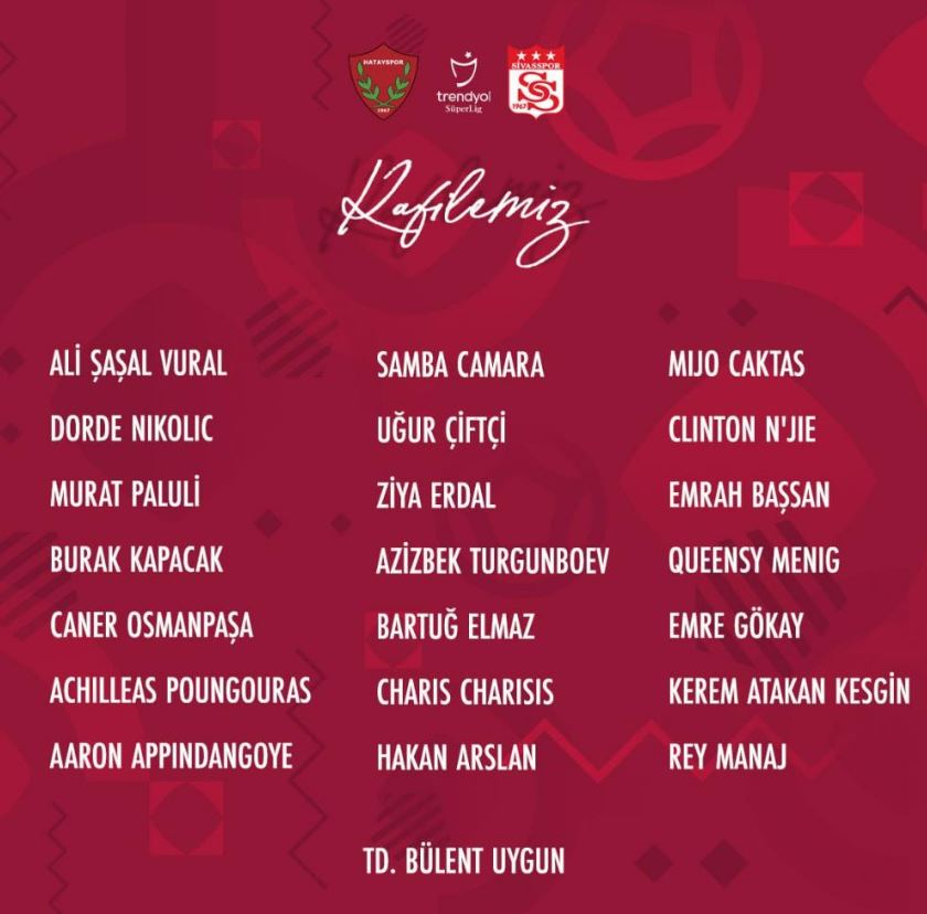 “Ali Şaşal Vural, Dorde Nikolic, Murat Paluli, Caner Osmanpaşa, Poungouras, Aaron Appindangoye, Samba Camara, Uğur Çiftçi, Ziya Erdal, Azizbek Turgunboev, Bartuğ Elmaz, Hakan Arslan, Mıjo Caktas, Clinton N’Jie, Emrah Başsan, Charis Charisis, Queensy Menig, Emre Gökay, Kerem Atakan Kesgin, Rey Manaj.” (İHA)