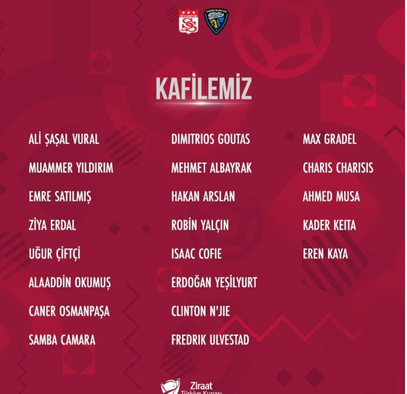 “Ali Şaşal Vural, Muammer Yıldırım, Emre Satılmış, Ziya Erdal, Uğur Çiftçi, Alaaddin Okumuş, Caner Osmanpaşa, Samba Camara, Dimitrios Goutas, Mehmet Albayrak, Hakan Arslan, Robin Yalçın, Isaac Cofie, Erdoğan Yeşilyurt, Clinton N'Jie, Fredrik Ulvestad, Max Gradel, Charis Charisis, Ahmed Musa, Kader Keita, Eren Kaya.”-iha