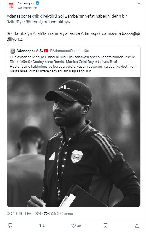 "Adanaspor teknik direktörü Sol Bamba’nın vefat haberini derin bir üzüntüyle öğrenmiş bulunmaktayız.