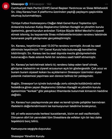 “Sayın Karasu’ya hatırlatmak isteriz ki; randevu talep eden taraf olmak, görüşme iradesinin ve ziyaret arzusunun açık bir göstergesidir. Çok ucuz ve buram buram siyaset kokan bu açıklamanın, Sivasspor üzerinden siyasi polemik malzemesi yapılması son derece talihsiz bir yaklaşımdır.”