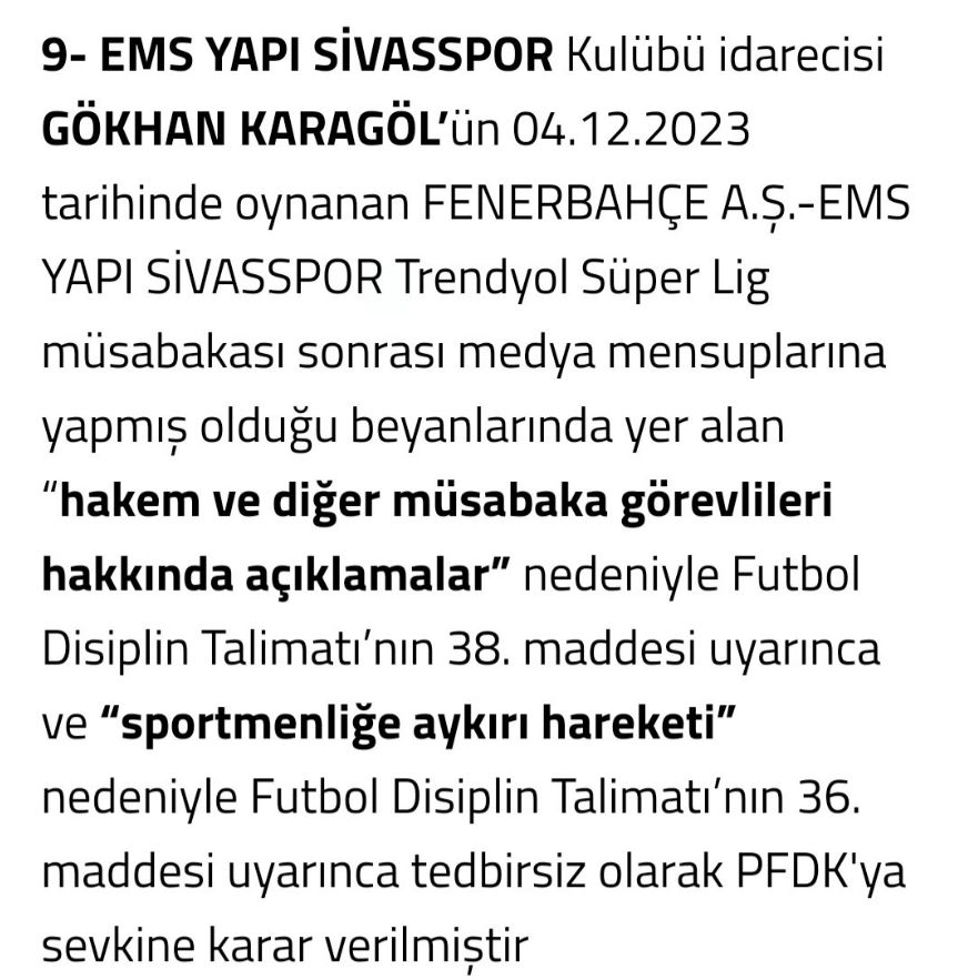 Sivassporlu yönetici Gökhan Karagöl PFDK'ya sevk edildi.