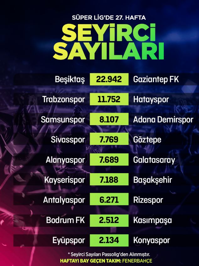Öte yandan Süper Lig’in 27. haftasında en az seyirci katılımı 2.134 ile Eyüpspor-Konyaspor maçında olurken, haftayı bay geçen takım Fenerbahçe oldu.
