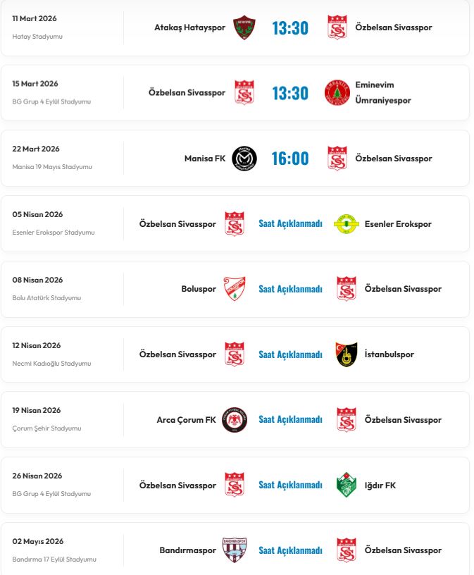 - 12 Nisan 2026: Özbelsan Sivasspor – İstanbulspor