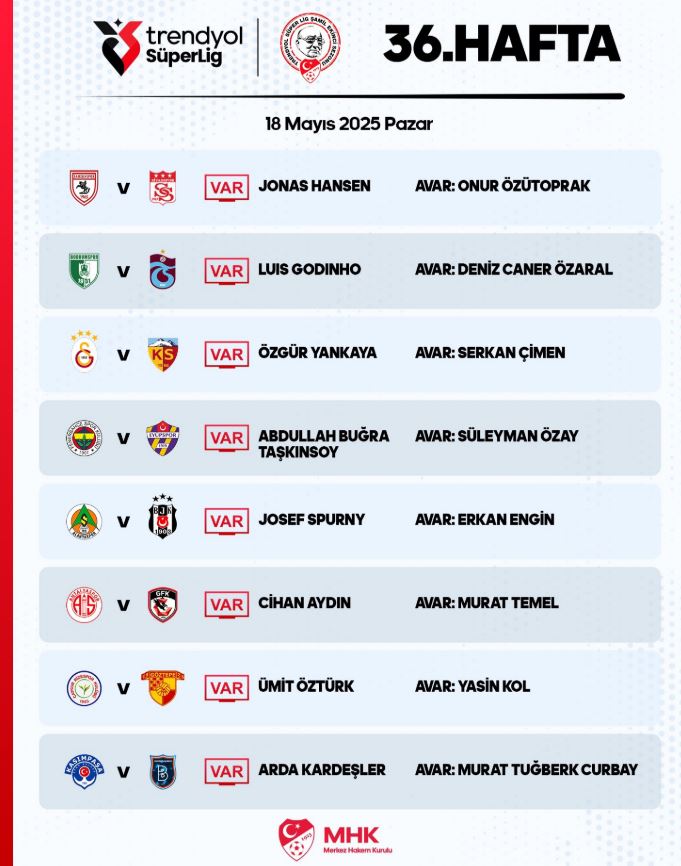 Trendyol Süper Lig’in 36. haftasında bugün (18 Mayıs 2025 Pazar) oynanacak karşılaşmalarda görev alacak VAR ve AVAR hakemleri Türkiye Futbol Federasyonu tarafından açıklandı.
