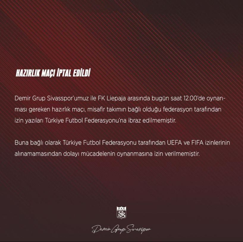 “DG Sivasspor’umuz ile FK Liepaja arasında saat 12.00’da oynanması gereken hazırlık maçı, misafir takımın bağlı olduğu federasyon tarafından izin yazıları Türkiye Futbol Federasyonu’na ibraz edilmemiştir. Buna bağlı olarak Türkiye Futbol Federasyonu tarafından UEFA ve FIFA izinlerinin alınamamasından dolayı mücadelenin oynanmasına izin verilmemiştir.”-iha