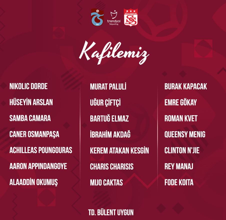 Sivasspor az önce sosyal medya hesabından yaptığı paylaşımda Trabzonspor maçı kamp kadrosunda olan oyuncuları açıkladı.