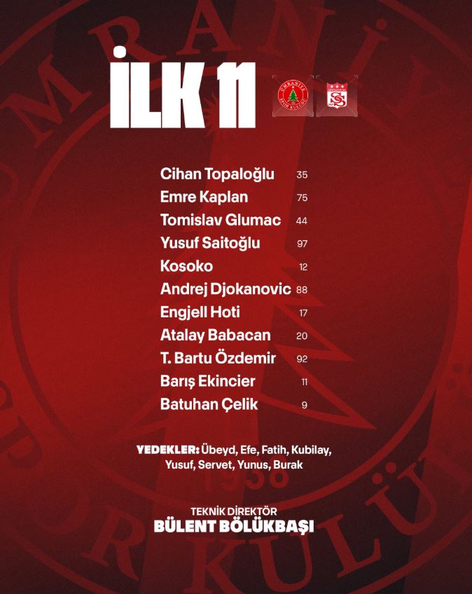 Trendyol Süper Lig’de haftanın dikkat çeken karşılaşmalarından biri olan Ümraniyespor – Sivasspor maçı öncesi kırmızı-beyazlı ekibin ilk 11’i ve yedek kadrosu belli oldu.