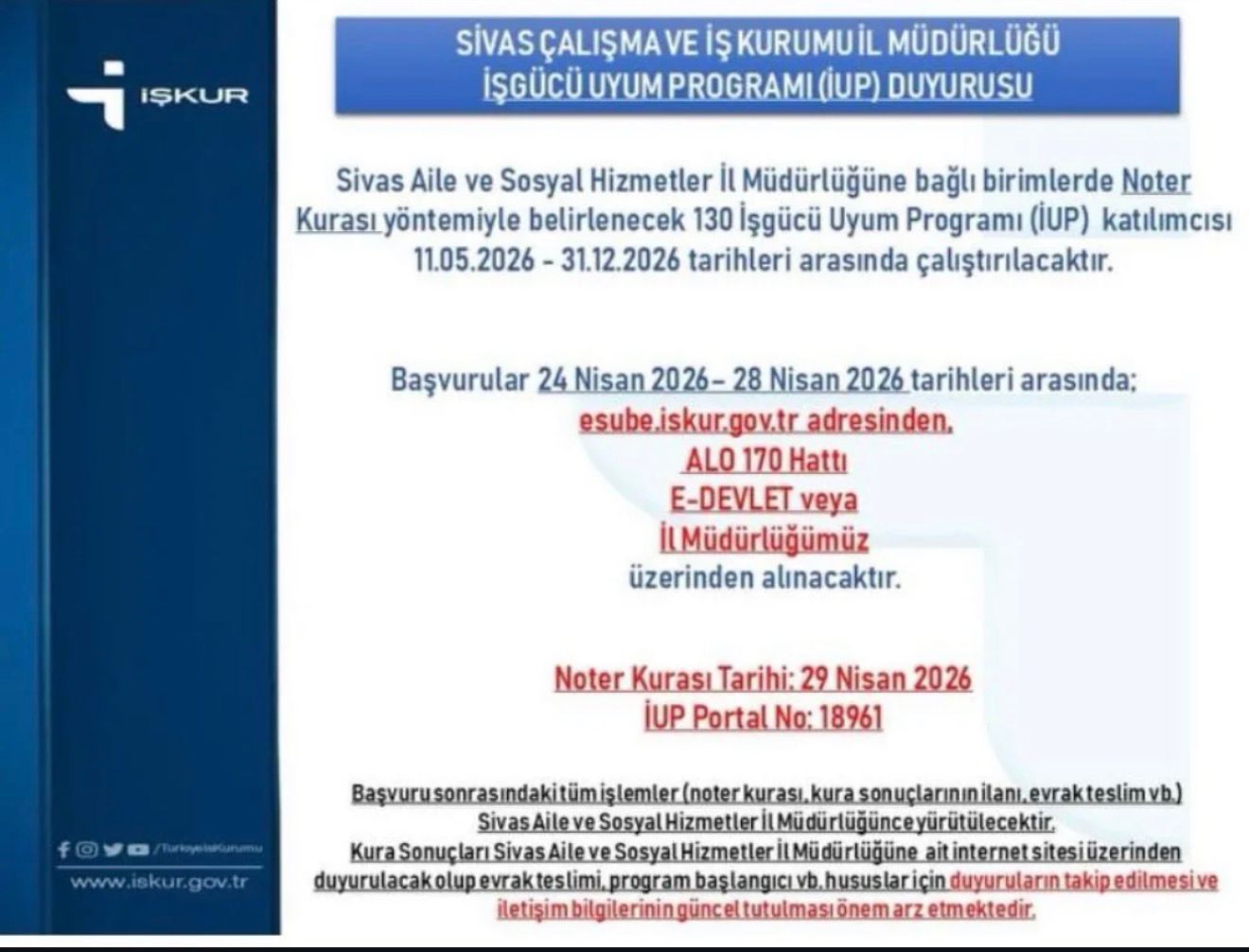 Başvuruların 24 Nisan 2026 ile 28 Nisan 2026 tarihleri arasında alınacağı belirtilirken, adayların başvurularını e-şube üzerinden, ALO 170 hattı aracılığıyla, e-Devlet üzerinden veya İŞKUR İl Müdürlüğü üzerinden gerçekleştirebileceği ifade edildi. Noter kura çekiminin ise 29 Nisan 2026 tarihinde yapılacağı bildirildi.