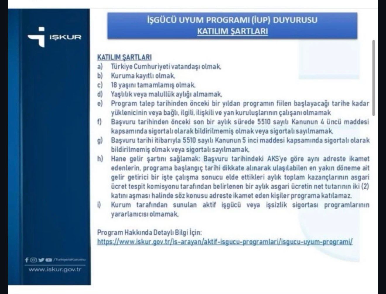 Program için belirlenen şartlar arasında Türkiye Cumhuriyeti vatandaşı olmak, 18 yaşını tamamlamış olmak, İŞKUR’a kayıtlı bulunmak ve belirlenen gelir kriterlerini sağlamak gibi koşullar yer alıyor. Ayrıca başvuru sahiplerinin son bir ay içerisinde sigortalı olarak çalışmamış olması ve aktif işgücü programlarından yararlanmıyor olması gerektiği belirtildi.