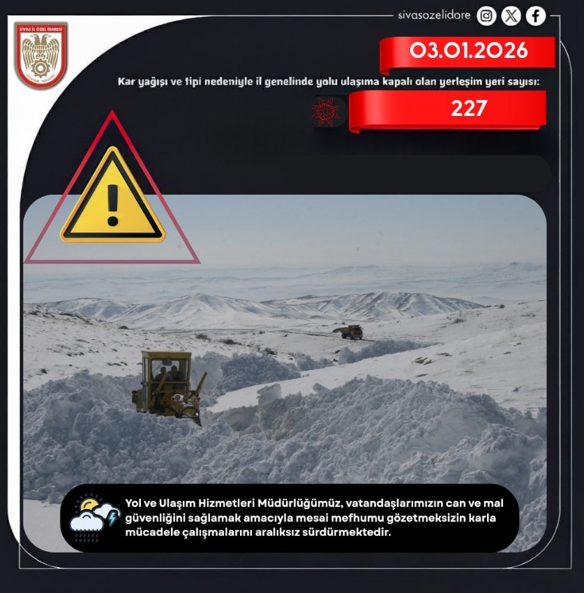 Sivas'ta 227 yerleşim yerine ulaşım geçici olarak sağlanamıyor.. 03.01.2026 tarihi itibarıyla il genelinde etkili olan yoğun kar yağışı ve olumsuz hava koşulları nedeniyle 227 yerleşim yerine geçici olarak ulaşım sağlanamıyor. Kapanan yolların açılması için ekipler sahada aralıksız çalışma yürütüyor.