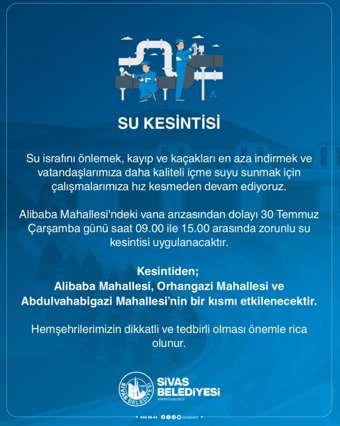 Sivas Belediyesi'nden yapılan açıklamaya göre, Alibaba Mahallesi’nde meydana gelen vana arızası nedeniyle 30 Temmuz Çarşamba günü 09.00-15.00 saatleri arasında planlı su kesintisi uygulanacak.