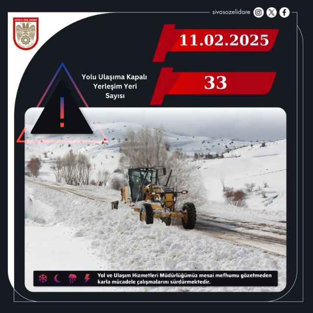 Sivas İl Özel İdaresi tarafından yapılan açıklamada, kapalı yolların açılması için ekiplerin sahada yoğun bir şekilde çalıştığı belirtildi. Özellikle yüksek kesimlerde etkili olan kar yağışı ve tipi nedeniyle sürücülerin dikkatli olmaları istendi.