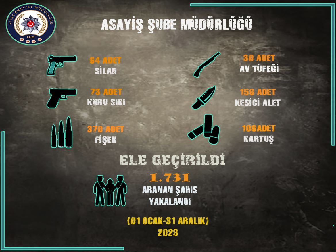 Sivas Emniyet Müdürlüğünün resmi sosyal medya hesabından yapılan açıklamada: "01 Ocak-31 Aralık 2023 Tarihleri Arasında Asayiş Şube Müdürlüğümüzce Yapılan Çalışmalar." ifadelerine yer verilirken şu görsel paylaşıldı;