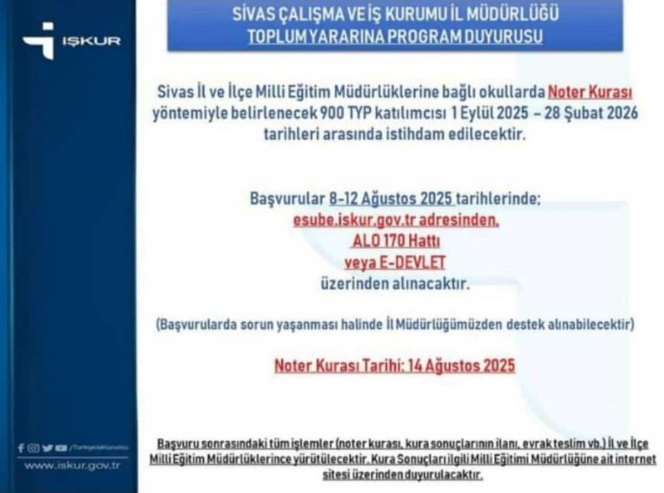 Sivas Çalışma ve İş Kurumu (İŞKUR) İl Müdürlüğü tarafından yapılan duyuruya göre, Sivas il ve ilçe Milli Eğitim Müdürlüklerine bağlı okullarda Toplum Yararına Program (TYP) kapsamında 900 kişi istihdam edilecek.