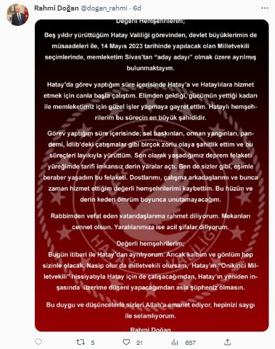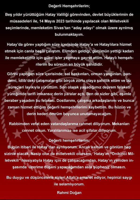 Hatay Valisi Rahmi Doğan AK Parti'den milletvekili aday adayı olmak için görevinden ayrıldığını sosyal medya hesabından duyurdu.