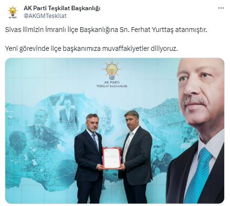 AK Parti tarafından yapılan paylaşımda: "Sivas ilimizin İmranlı İlçe Başkanlığına Sn. Ferhat Yurttaş atanmıştır.
