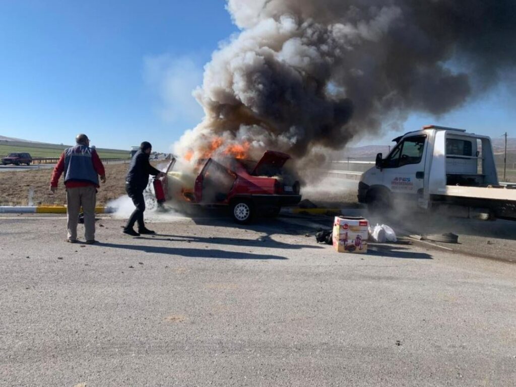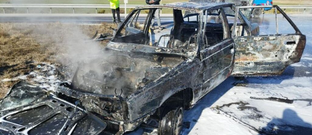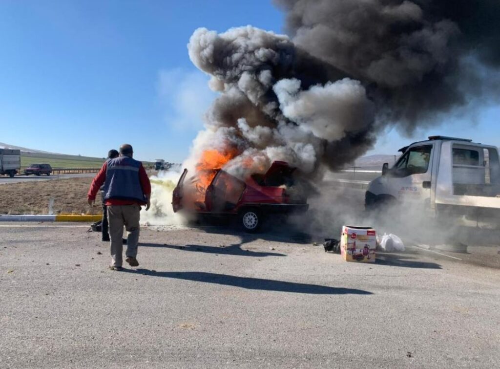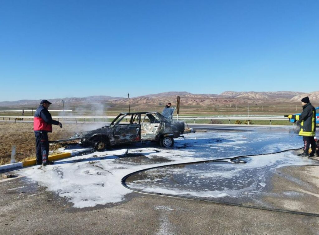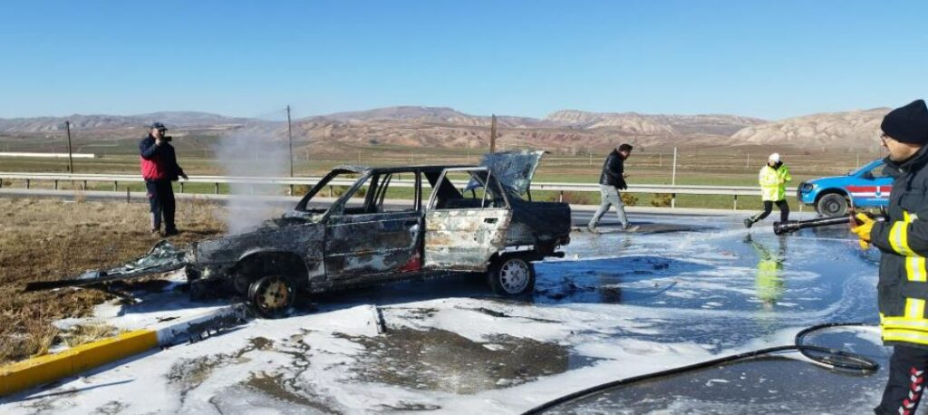 Sivas’ın Şarkışla ilçesinde kaza yaptıktan sonra alev alan otomobil hurdaya döndü, yangın anları ise saniye saniye cep telefonu kamerasına yansıdı.