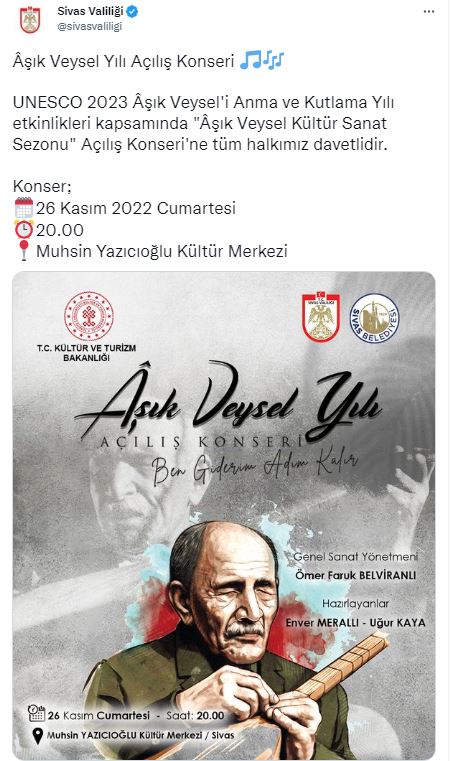 UNESCO 2023 Âşık Veysel'i Anma ve Kutlama Yılı etkinlikleri kapsamında "Âşık Veysel Kültür Sanat Sezonu" Açılış Konseri 26 Kasım 2022 Cumartesi günü gerçekleştirilecek.