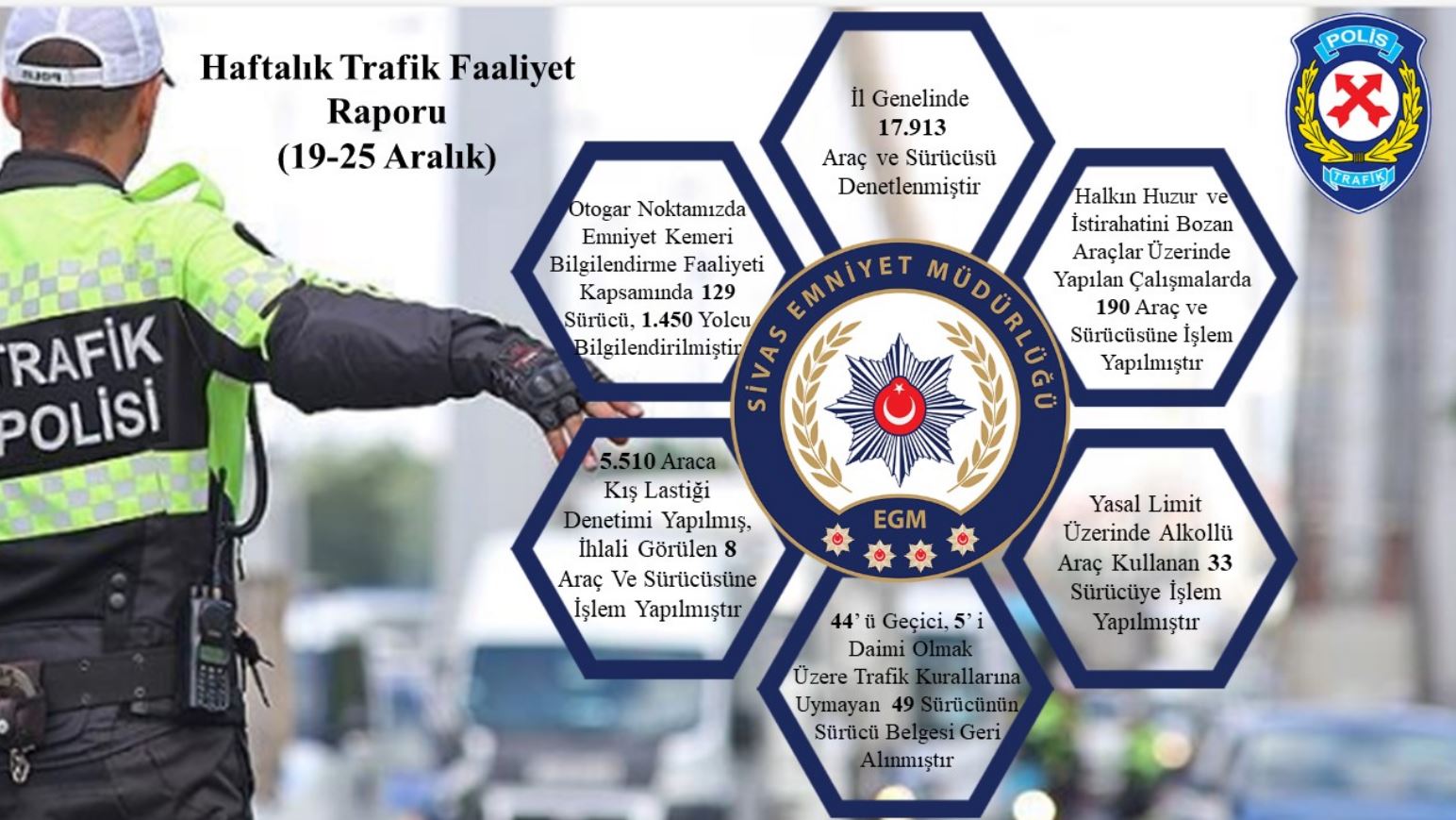 Sivas’ta bir haftada 17 bin 913 araç ve sürücü denetlendi.. Sivas’ta trafik güvenliğinin sağlanmasına yönelik yürütülen denetimlerin bilançosu açıklandı. İl Emniyet Müdürlüğü tarafından paylaşılan 19–25 Aralık tarihlerini kapsayan Haftalık Trafik Faaliyet Raporu, kent genelinde gerçekleştirilen denetimlerin kapsamını gözler önüne serdi.