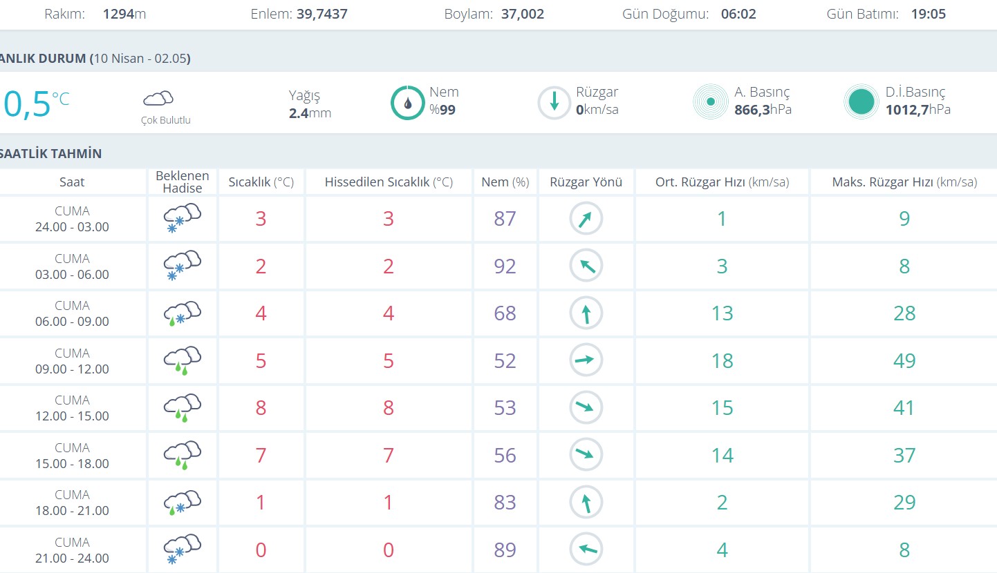 Saatlik verilere göre gece saatlerinde sıcaklık 3 derece civarında seyrederken, sabaha karşı 2 dereceye kadar düşüyor. Sabah saatlerinden itibaren ise sıcaklık yükselerek öğle saatlerinde 8 dereceye kadar çıkıyor. Günün ilerleyen saatlerinde yeniden düşüşe geçen sıcaklık, akşam saatlerinde 1 dereceye, gece saatlerinde ise 0 dereceye kadar geriliyor.