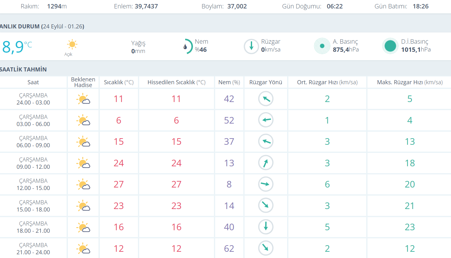 24 Eylül Çarşamba günü kentte sabah saatlerinde 6 dereceye kadar düşen sıcaklık, öğle saatlerinde 27 dereceye kadar yükselecek. Gün boyu yağış beklenmezken, kentte parçalı bulutlu ve açık bir hava hakim olacak.