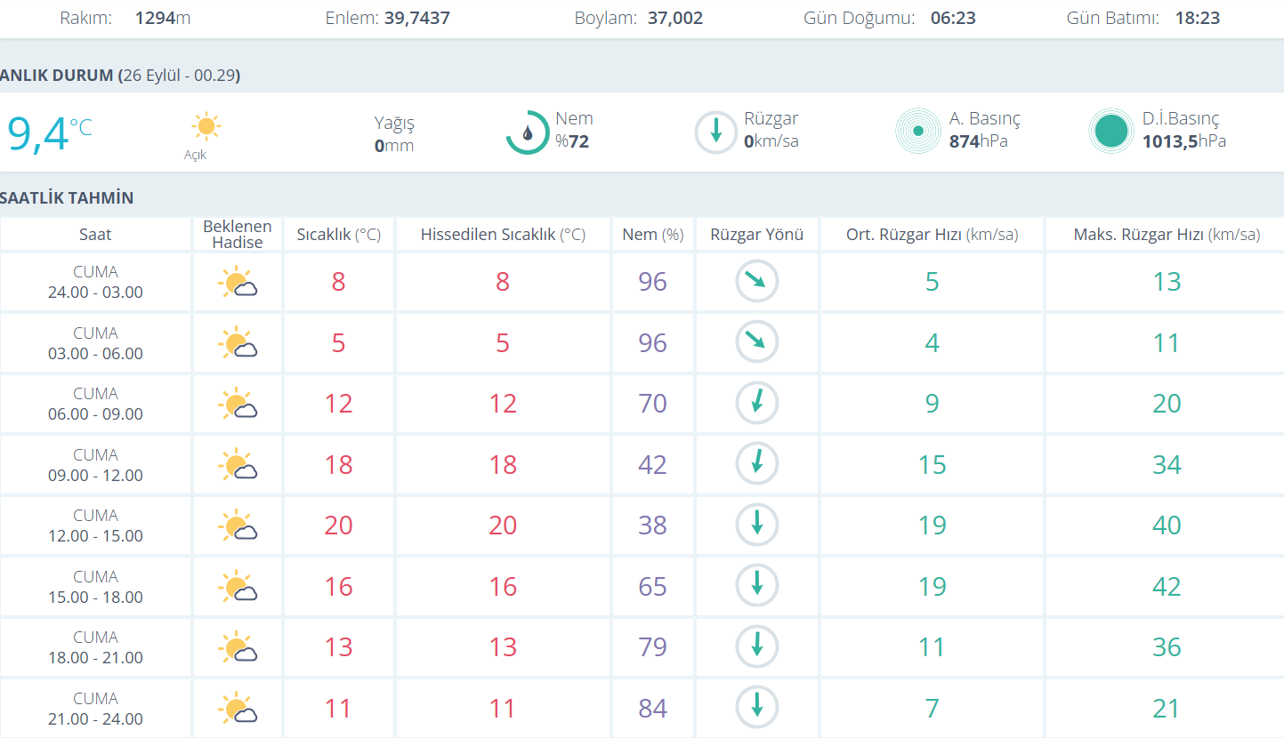 Sabah saatlerinde %96’ya kadar çıkan nem oranı, öğleye doğru %38’e kadar düşecek. Gün boyu rüzgar kuzey ve kuzeydoğu yönlerinden esecek, öğle saatlerinde ortalama 19 km/sa hıza, maksimumda ise 42 km/sa hıza ulaşması bekleniyor.