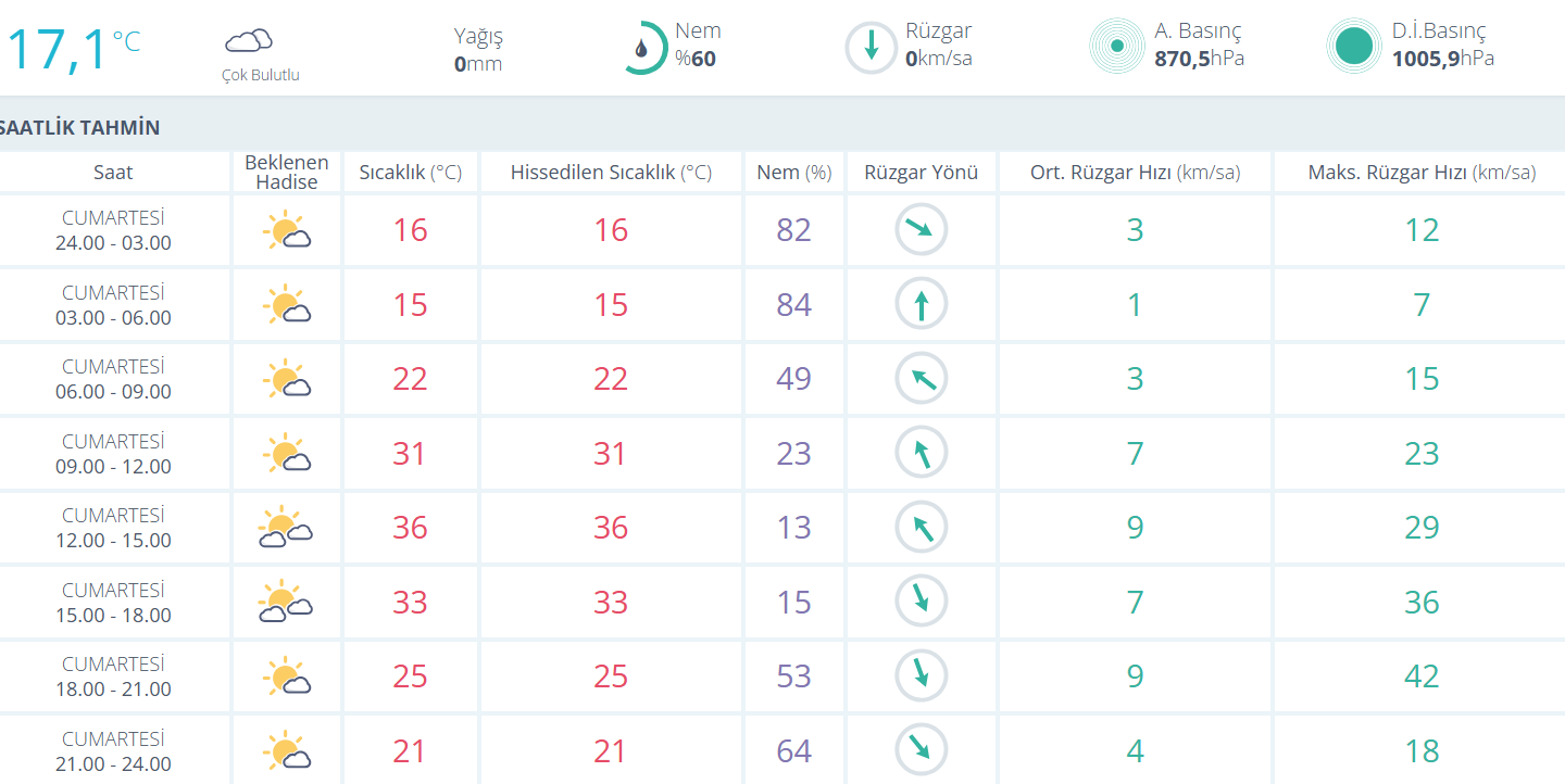 Sabaha karşı 03.00-06.00 saatleri arasında sıcaklık 15 derece olurken, nem oranı yüzde 84’lere kadar yükseliyor. Öğleye doğru sıcaklığın 31 dereceye çıkacağı, 12.00-15.00 saatleri arasında ise en yüksek 36 dereceye ulaşacağı tahmin ediliyor. Bu saatlerde nem oranı yüzde 13’e kadar düşecek.
