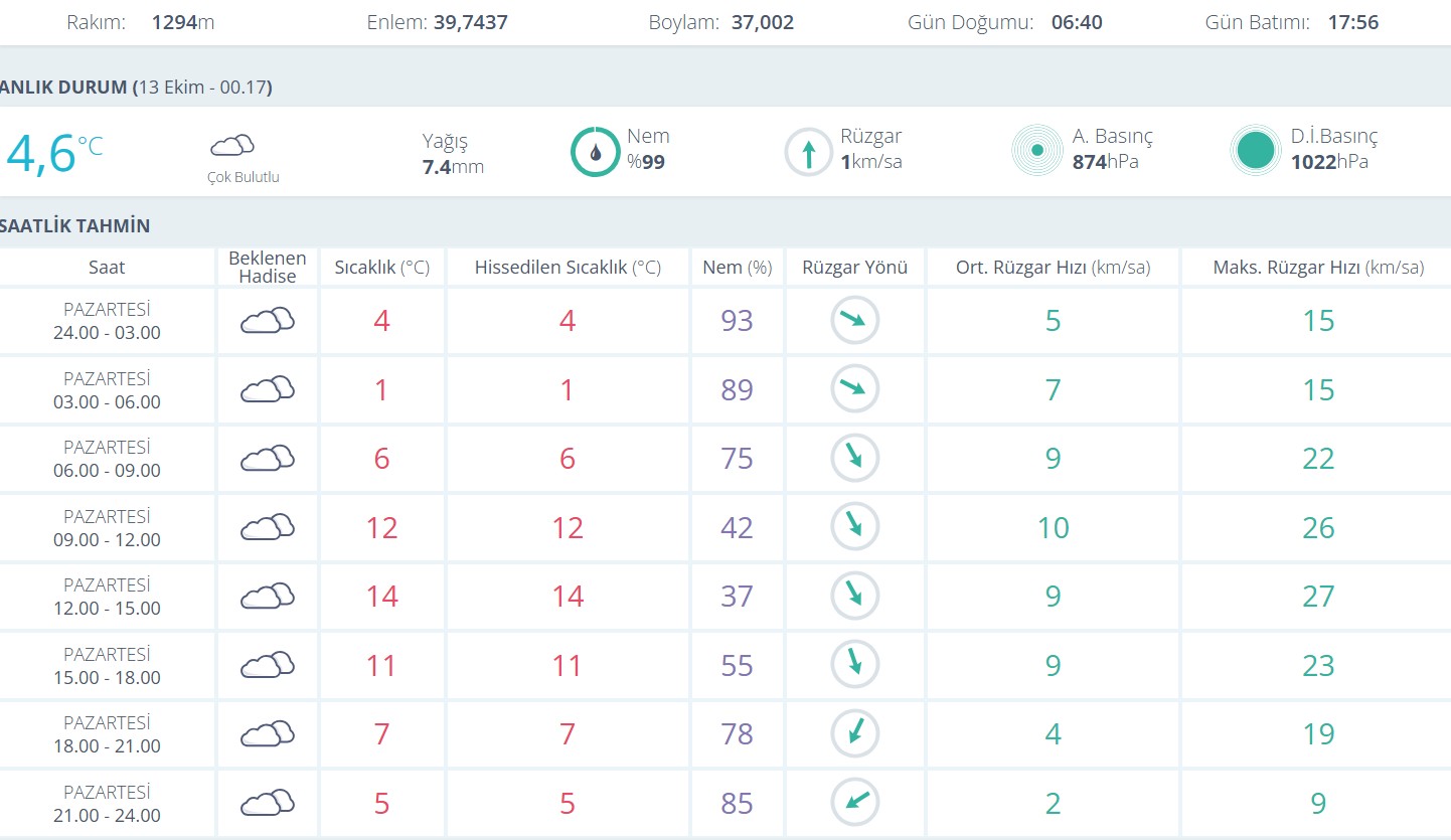 Meteoroloji Genel Müdürlüğü verilerine göre, 13 Ekim Pazartesi günü sabah saatlerinde sıcaklık 1 dereceye kadar düşecek. Gün içerisinde hava çok bulutlu olacak, öğle saatlerinde sıcaklık 14 dereceye kadar yükselecek. Akşam saatlerinde ise sıcaklığın yeniden 5 dereceye kadar gerilemesi bekleniyor.