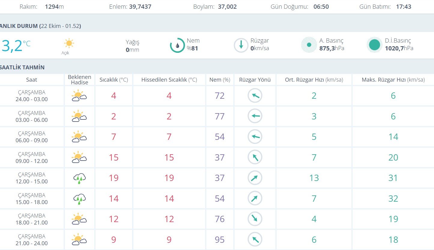 Gece saatlerinde sıcaklık 3,2 dereceye kadar düşerken, nem oranı yüzde 81 olarak ölçüldü. Rüzgar hızı ise sabah erken saatlerde 0 kilometre/saat olarak kaydedildi.