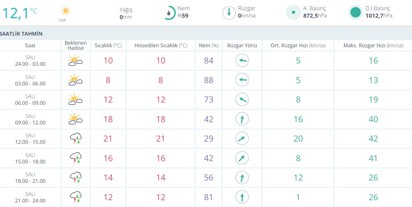 Şu anda kentte sıcaklık 12,1°C, nem oranı %59 seviyesinde ölçüldü. Sabah erken saatlerde 8-12 derece aralığında seyredecek sıcaklıklar, öğlen 21°C'ye kadar yükselecek. Nem oranı ise gün içinde düşerek %29 seviyelerine kadar inecek.