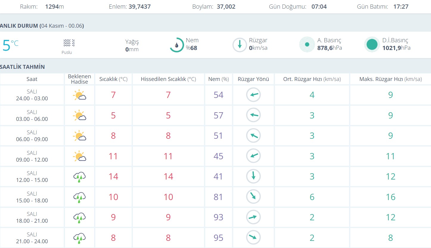 Meteoroloji verilerine göre, kentte 04 Kasım Salı gününün ilk saatlerinde hava sıcaklığı 5°C, nem oranı ise yüzde 68 olarak ölçüldü. Rüzgarın sakin olduğu kentte gün boyunca zaman zaman parçalı bulutlu bir hava bekleniyor.