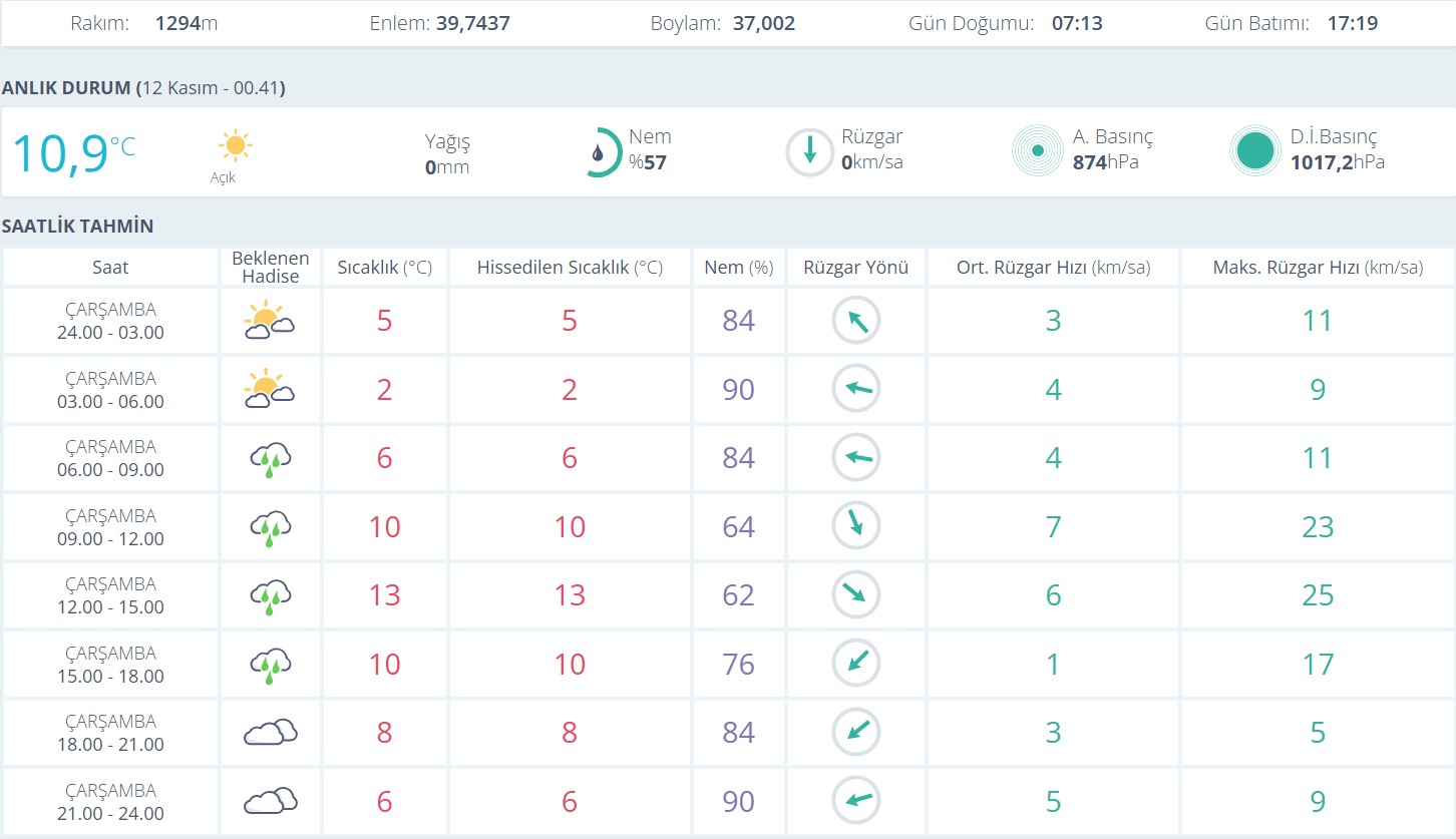 Gece saatlerinde 10,9 derece olarak ölçülen hava sıcaklığı sabaha karşı 2 dereceye kadar düşecek. Çarşamba sabah saatlerinden itibaren il genelinde aralıklı sağanak yağış bekleniyor. Özellikle 09.00 ile 15.00 saatleri arasında yağışların etkisini artırması tahmin ediliyor.