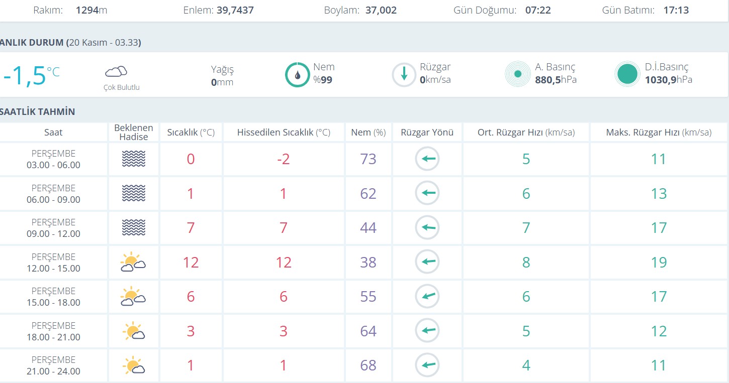20 Kasım Perşembe günü için açıklanan tahminlere göre kentte sabaha karşı –1,5°C ölçülen sıcaklık, gün içinde kademeli olarak artacak.