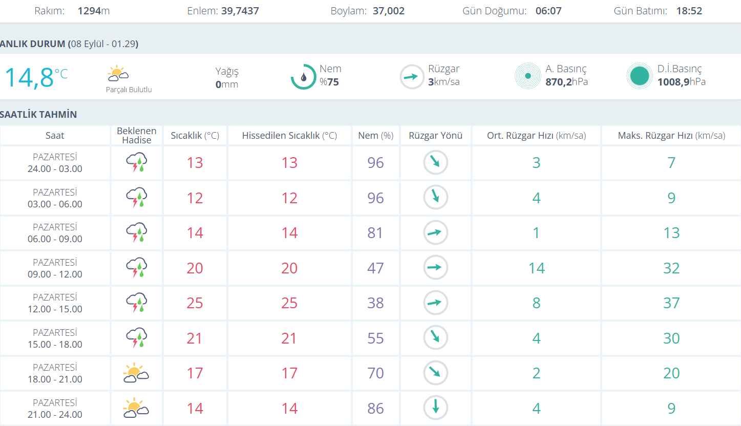 Meteoroloji verilerine göre Sivas’ta 8 Eylül Pazartesi günü gök gürültülü sağanak yağış etkili olacak.