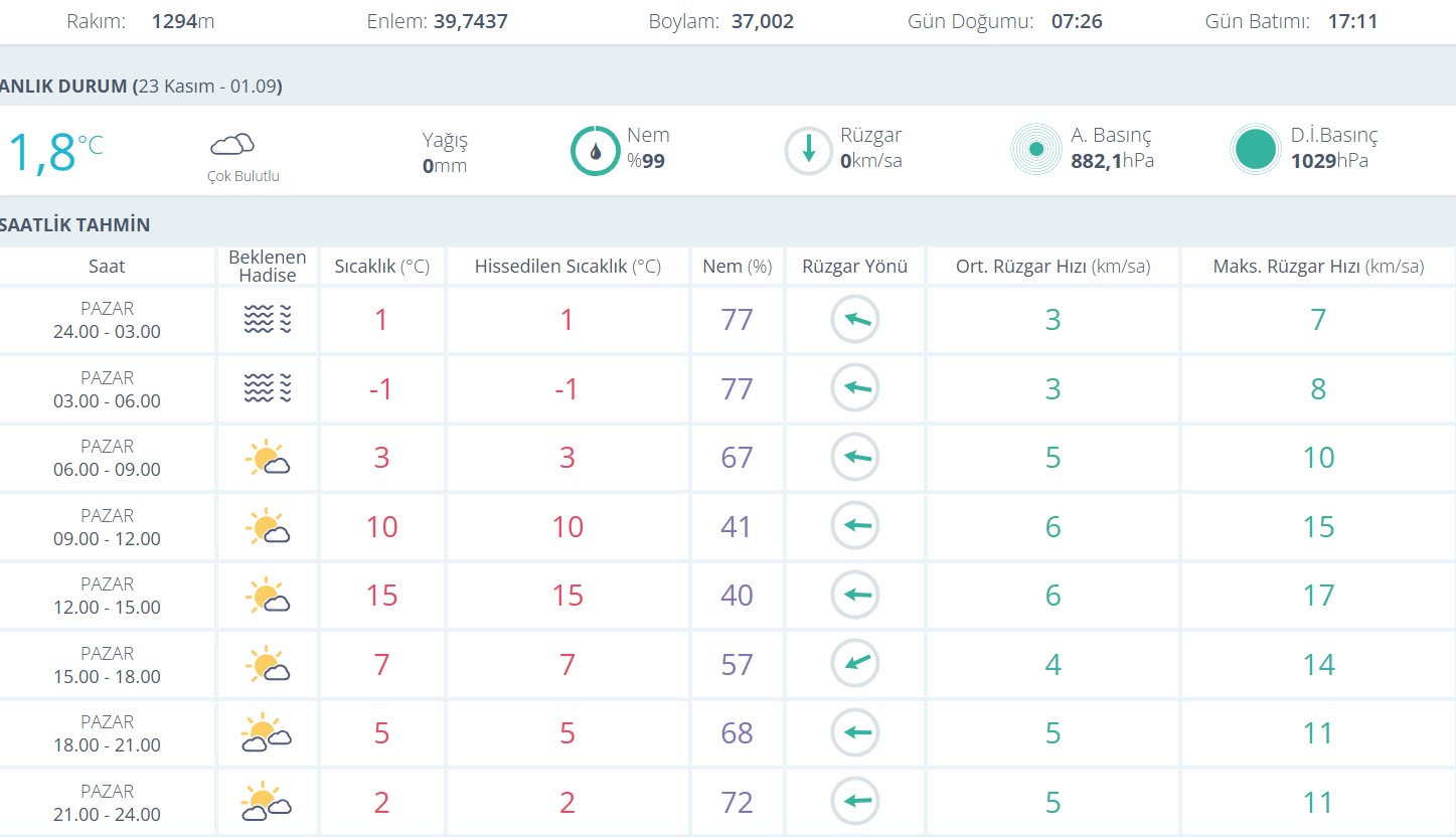 Sivas’ta 23 Kasım Pazar gününe ait saatlik hava durumu raporu yayımlandı.
