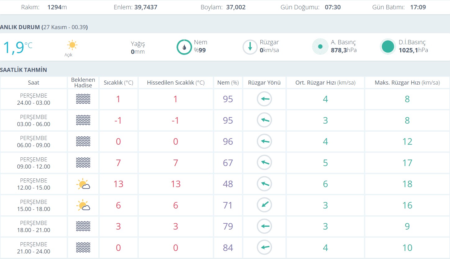Nem oranının yüzde 99’a kadar yükseldiği kentte rüzgarın saatlik 0 km/s seviyesinde olması dikkat çekti. Yağış görülmeyen şehirde gün içinde sıcaklıkların belirgin şekilde artması bekleniyor.