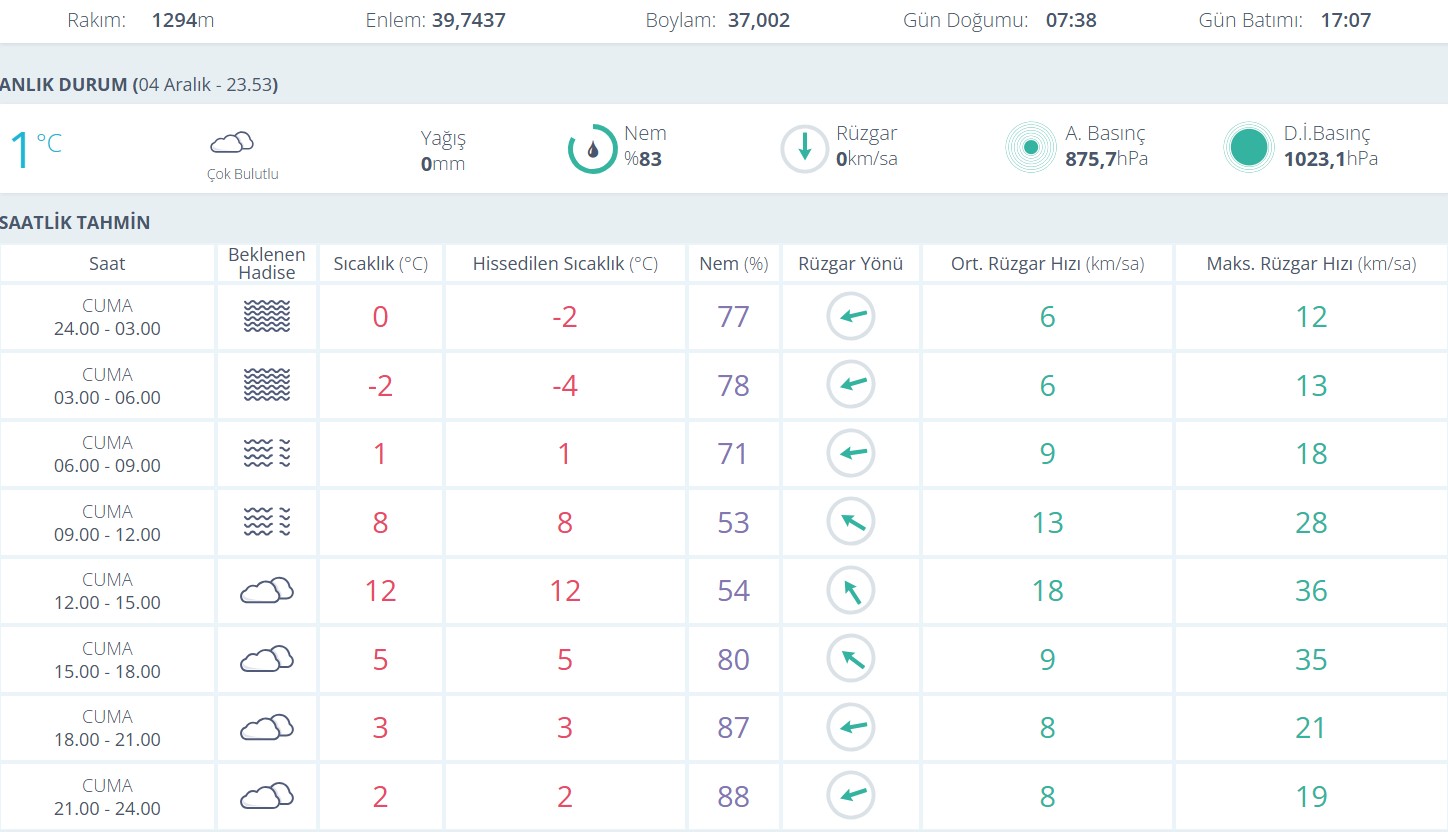 Saat 12.00 – 15.00 arasında sıcaklığın 12°C’ye kadar yükseleceği tahmin ediliyor. Çok bulutlu hava seyrini sürdürürken, rüzgâr hızının zaman zaman 18 km/s seviyelerine ulaşacağı belirtiliyor.