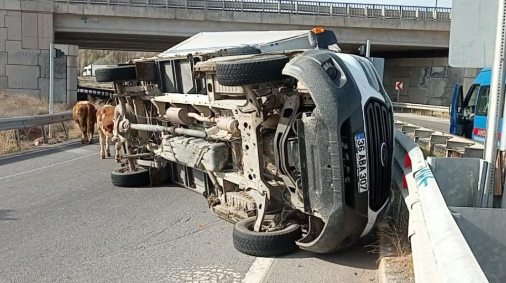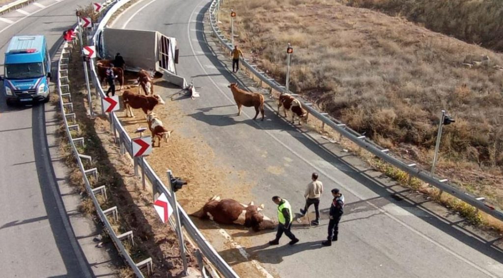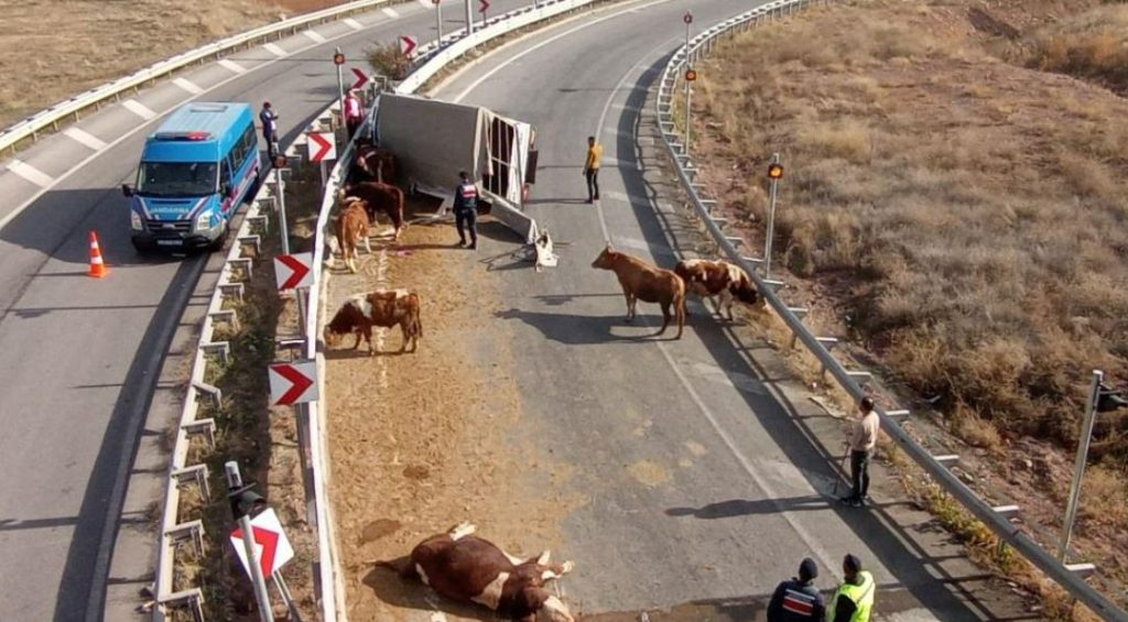 Edinilen bilgilere göre, kaza, Şarkışla-Sivas karayolu Kovala kavşağı mevkiinde meydana geldi. Şarkışla hayvan pazarından 8 büyükbaş hayvanı Erzincan istikametine götüren M.Y. idaresindeki 36 ABA 307 Ford marka kamyonet sürücüsünün Kovala kavşağı mevkiinde direksiyon hâkimiyetini kaybetmesi sonucunda devrildi. Devrilen kamyonette bulunan 8 büyükbaş hayvan yola fırladı. Yola fırlayan 8 hayvandan biri telef olurken diğer hayvanlar ot yemeye devam etti. Kaza sonucunda otoyol araç trafiğine kapanırken sürücü M.Y. olay yerine gelen 112 ekiplerinin müdahalesinin ardından hastaneye kaldırıldı. Polis ekipleri kaza ile ilgili inceleme başlattı. (İHA)