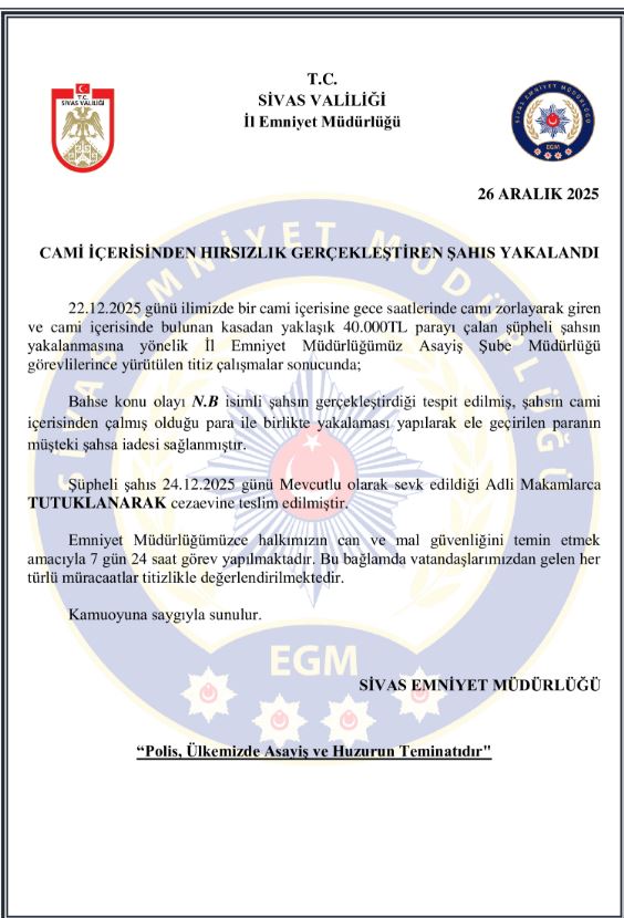 Sivas Valiliği İl Emniyet Müdürlüğü tarafından yapılan açıklamaya göre, olay 22 Aralık 2025 günü il merkezinde bulunan bir camide gerçekleşti. Kimliği belirsiz bir şahsın gece saatlerinde camiye girerek cami içerisinde bulunan kasadan yaklaşık 40 bin TL’yi çaldığı ihbarı üzerine Asayiş Şube Müdürlüğü ekipleri tarafından çalışma başlatıldı.