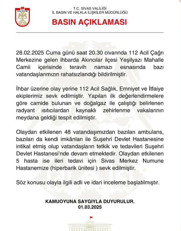 Sivas’ın Akıncılar ilçesinde bulunan Yeşilyazı Mahalle Camii’nde, teravih namazı sırasında doğal gaz sobasından sızan gazdan etkilenen 48 kişiyle ilgili Sivas Valiliği adli ve idari inceleme başlattı.