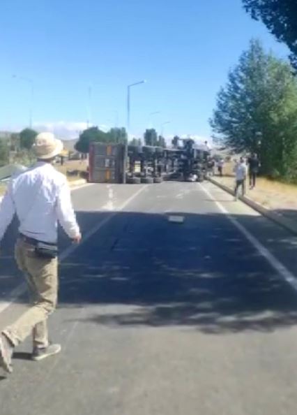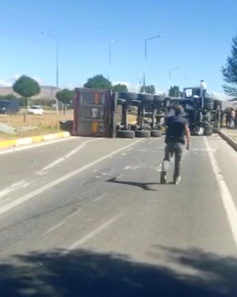 Sivas'ta damperi açık unutulan tır kaza yaptıktan sonra yan yattı!