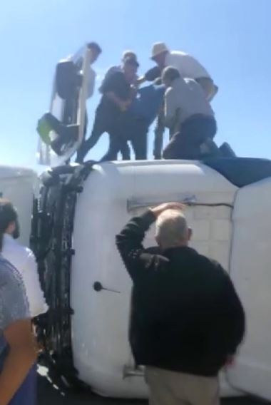 Sivas’ın Hafik ilçesinde damperi açık unutulan tır, ortalama hız tespit sisteminin (OHTS) bulunduğu direğe çarptıktan sonra yan yattı, kaza sonucu yaralanan sürücünün yardımına vatandaşlar koştu.