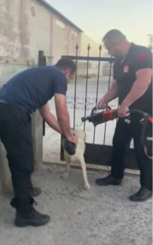 Sivas’ta bir fabrikanın demir kapısının parmaklıklarına sıkışan köpeği itfaiye ekipleri kurtardı.
