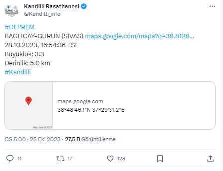 Kandilli Rasathanesi'nden alınan bilgiye göre Sivas'ın Gürün ilçesine bağlı Bağlıçay mahallesinde 3.3 büyüklüğünde deprem meydana geldi.